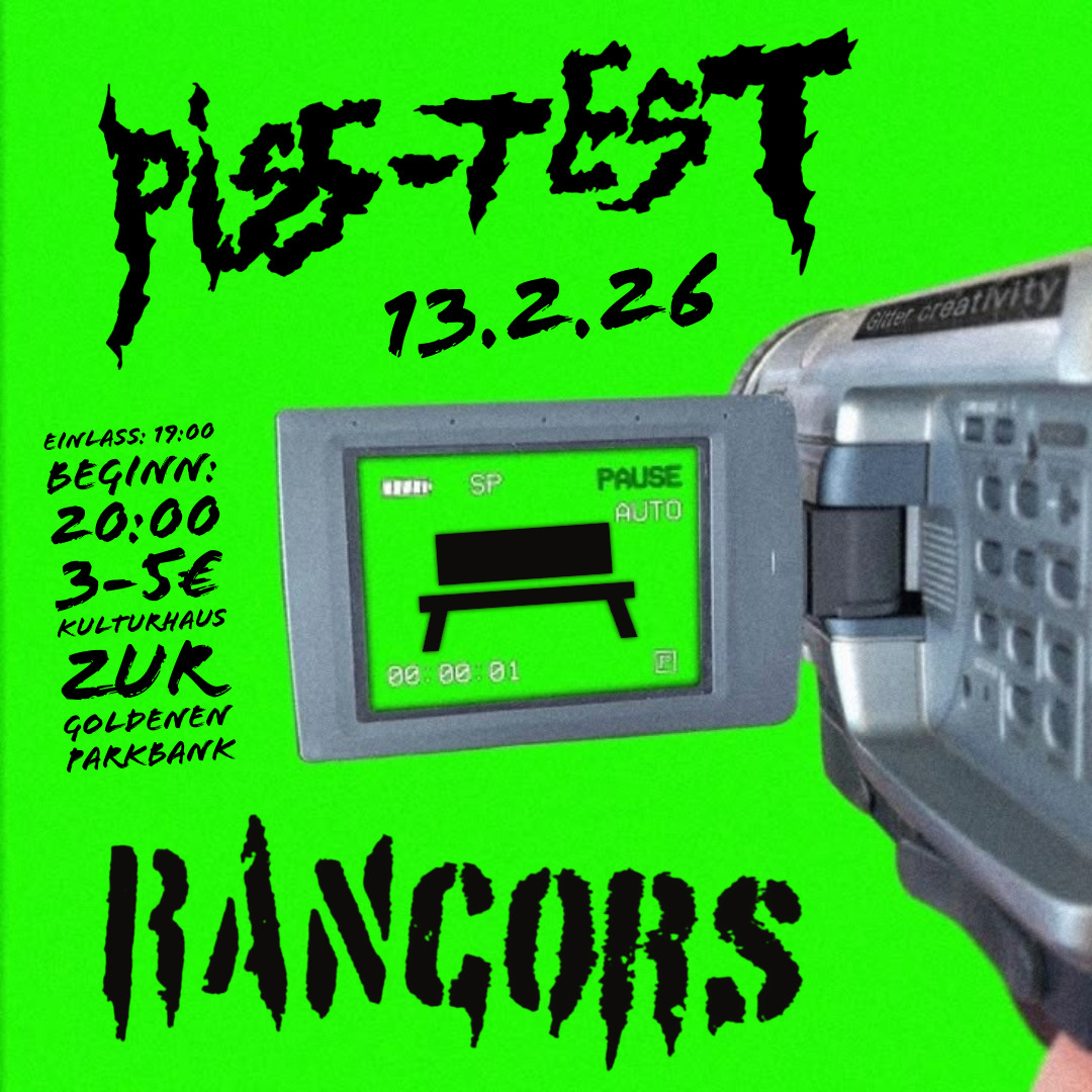 Am 13.2. fliegen die Fetzen im Keller mit Piss-Test und den RancorsEinlass: 19:00Beginn: 20:00Eintritt: 3-5€
