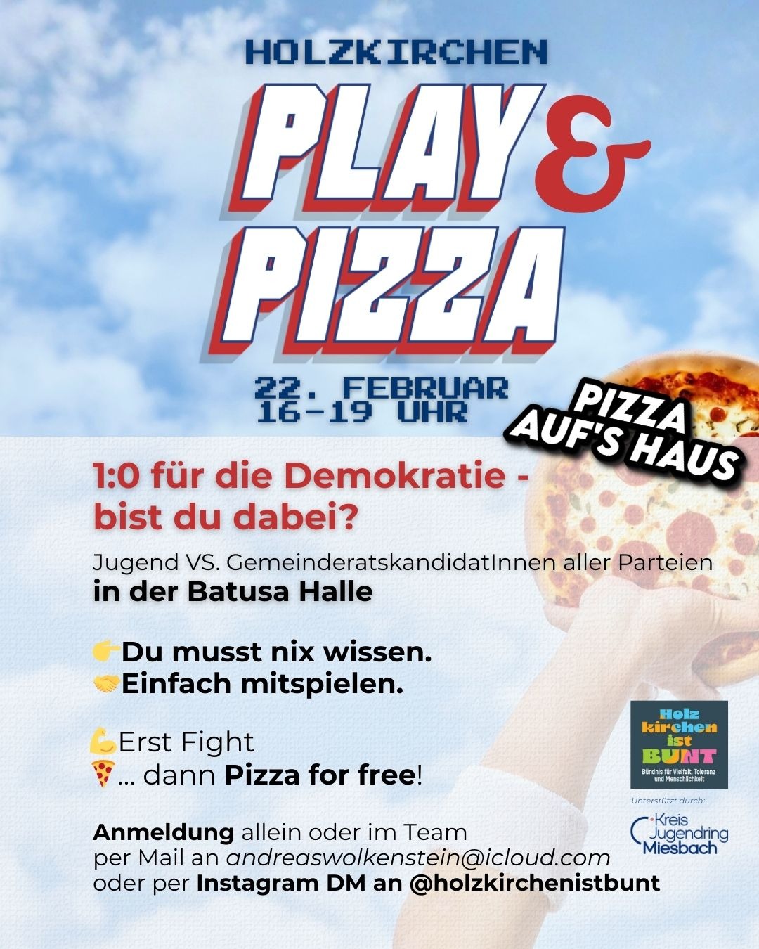Die Idee: Jugendliche treten gegen (oder auch im Team mit) Kandidat:innen für den Holzkirchner Gemeinderat an. Zuerst der Fight, dann Pizza for free (die geht nämlich auf uns). Was gespielt wird? Lasst euch überraschen! (Vermutlich Dodgeball, aber 🤫)